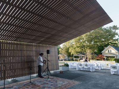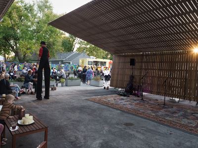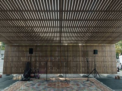 A sculptural trellis designed, fabricated, and installed by the architect transforms a parking lot at InterUrban ArtHouse into a vibrant performance and event space. Providing shade, identity, and revenue potential, the project also served as a hands-on training opportunity for emerging designers under close professional mentorship.