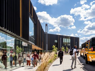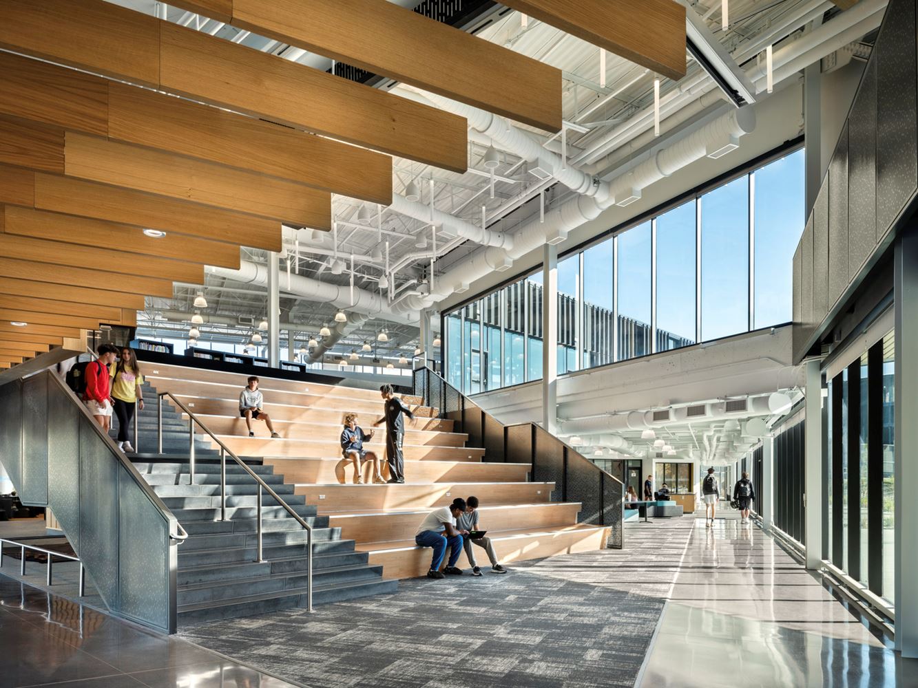 This reimagined high school campus transforms disconnected buildings into a cohesive, future-ready environment. Anchored by Innovation Way and The Greenway, the design promotes movement, collaboration, and real-world learning. Innovation Hubs provide flexible, work-like settings where students gain marketable skills and explore career pathways through hands-on, project-based experiences.